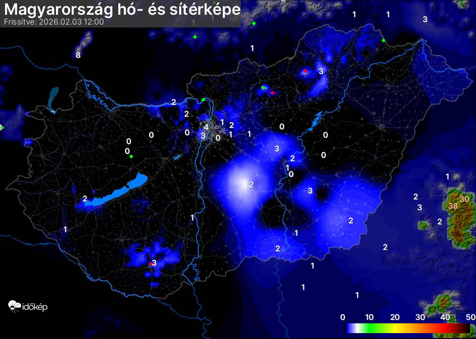 Hótérképünkön hazánk síterepei mellett észlelőink által jelzett hóvastagság adatok is