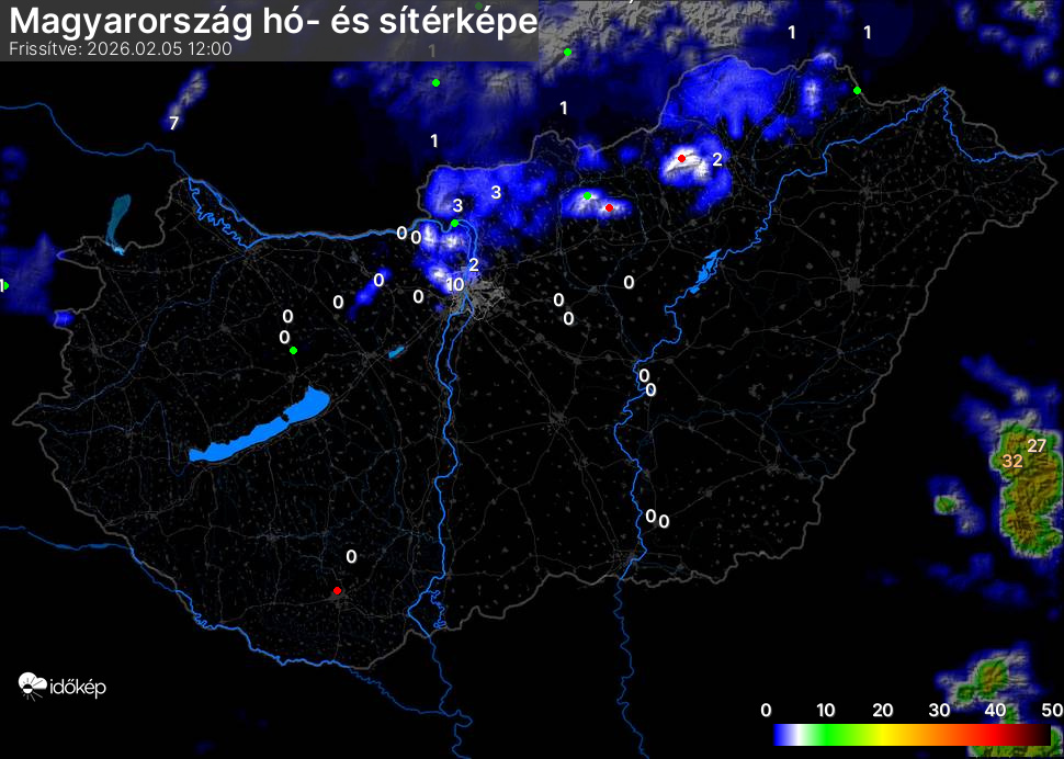 Hótérképünkön hazánk síterepei mellett észlelőink által jelzett hóvastagság adatok is