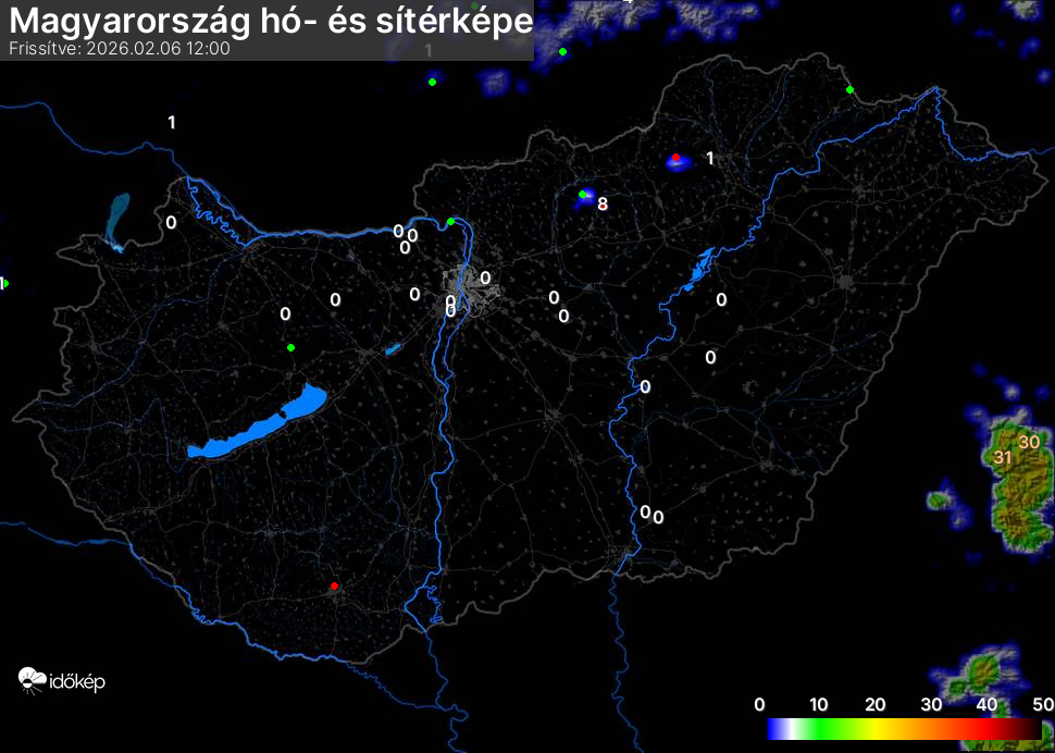 Hótérképünkön hazánk síterepei mellett észlelőink által jelzett hóvastagság adatok is