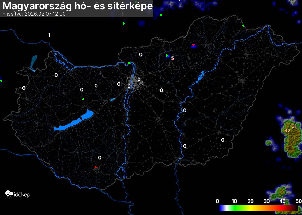 Hótérképünkön hazánk síterepei mellett észlelőink által jelzett hóvastagság adatok is