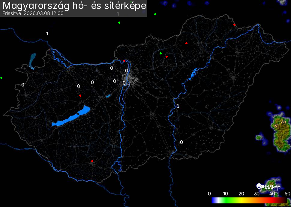 Hótérképünkön hazánk síterepei mellett észlelőink által jelzett hóvastagság adatok is