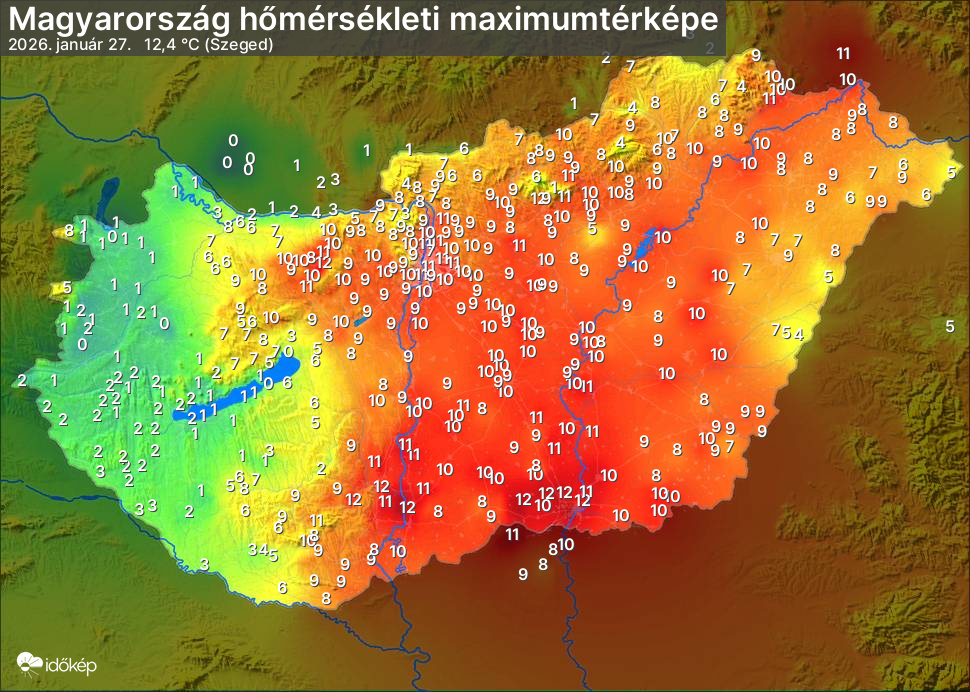 A maximumtérképen kirajzolódik az adott napon mért legmagasabb hőmérsékletek térbeli eloszlása. Az adott nap hőmérsékleti maximumát télen reggel és este 7 óra, nyáron reggel és este 8 óra között mért legmagasabb értékkel adjuk meg. Adatbeküldés: következő nap reggel 4 óráig.