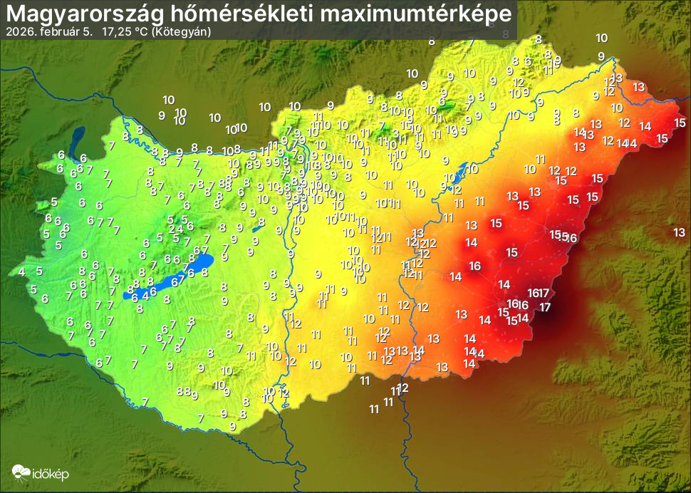 A maximumtérképen kirajzolódik az adott napon mért legmagasabb hőmérsékletek térbeli eloszlása. Az adott nap hőmérsékleti maximumát télen reggel és este 7 óra, nyáron reggel és este 8 óra között mért legmagasabb értékkel adjuk meg. Adatbeküldés: következő nap reggel 4 óráig.