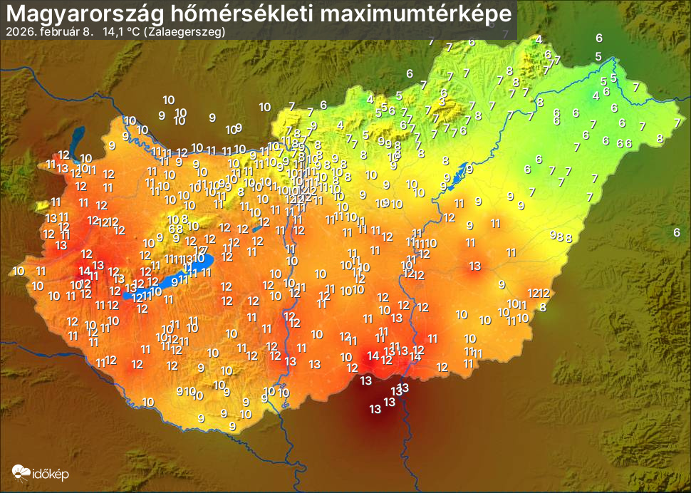 A maximumtérképen kirajzolódik az adott napon mért legmagasabb hőmérsékletek térbeli eloszlása. Az adott nap hőmérsékleti maximumát télen reggel és este 7 óra, nyáron reggel és este 8 óra között mért legmagasabb értékkel adjuk meg. Adatbeküldés: következő nap reggel 4 óráig.