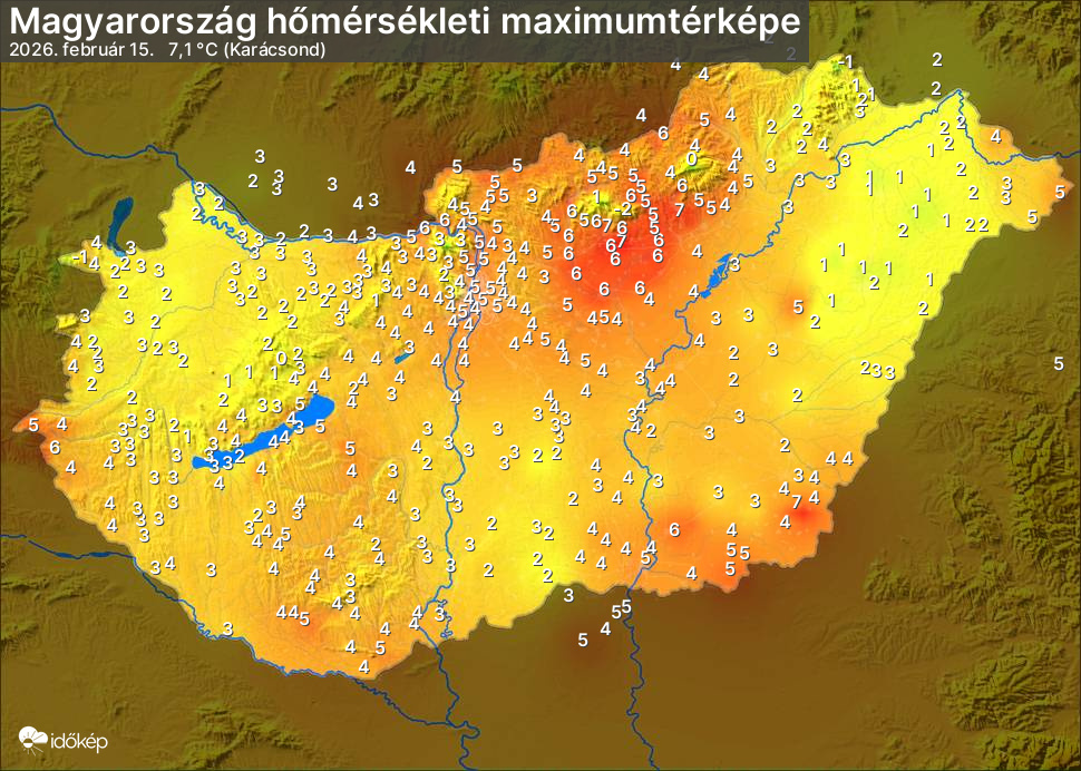 A maximumtérképen kirajzolódik az adott napon mért legmagasabb hőmérsékletek térbeli eloszlása. Az adott nap hőmérsékleti maximumát télen reggel és este 7 óra, nyáron reggel és este 8 óra között mért legmagasabb értékkel adjuk meg. Adatbeküldés: következő nap reggel 4 óráig.