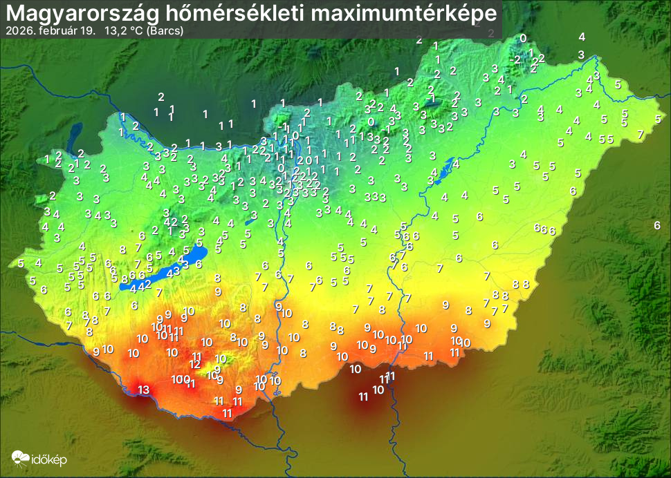 A maximumtérképen kirajzolódik az adott napon mért legmagasabb hőmérsékletek térbeli eloszlása. Az adott nap hőmérsékleti maximumát télen reggel és este 7 óra, nyáron reggel és este 8 óra között mért legmagasabb értékkel adjuk meg. Adatbeküldés: következő nap reggel 4 óráig.