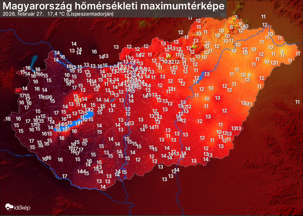 A maximumtérképen kirajzolódik az adott napon mért legmagasabb hőmérsékletek térbeli eloszlása. Az adott nap hőmérsékleti maximumát télen reggel és este 7 óra, nyáron reggel és este 8 óra között mért legmagasabb értékkel adjuk meg. Adatbeküldés: következő nap reggel 4 óráig.