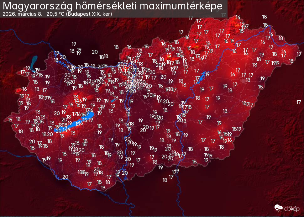 A maximumtérképen kirajzolódik az adott napon mért legmagasabb hőmérsékletek térbeli eloszlása. Az adott nap hőmérsékleti maximumát télen reggel és este 7 óra, nyáron reggel és este 8 óra között mért legmagasabb értékkel adjuk meg. Adatbeküldés: következő nap reggel 4 óráig.