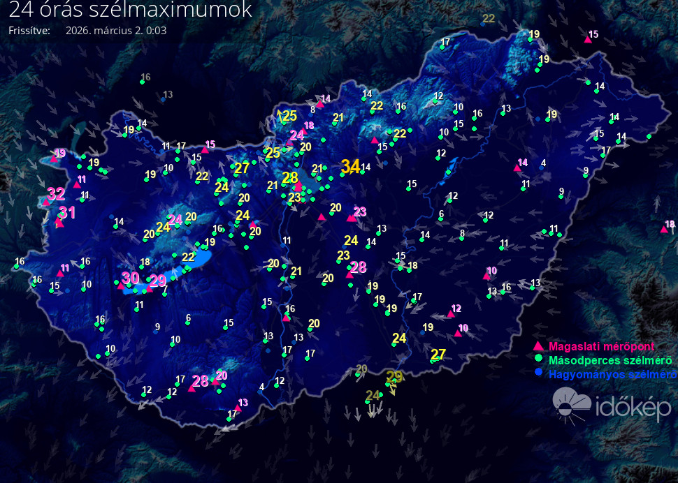 5 percenként frissítve, az elmúlt 24 óra méréseiből,